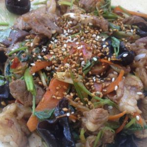 热锅凉油,加入肉片爆炒两分钟,加入葱丝,大火翻炒,加入适量白酒去腥