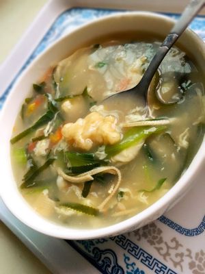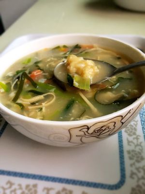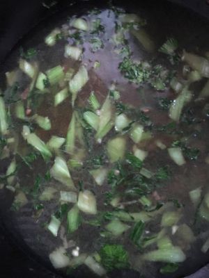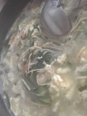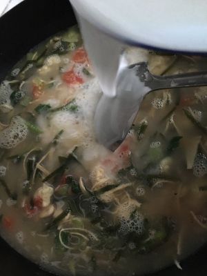 将洗面筋的水分次倒入,要看锅里汤的浓稀度分次倒入,最后煮开再煮一会,这时要不停搅拌防止粘底