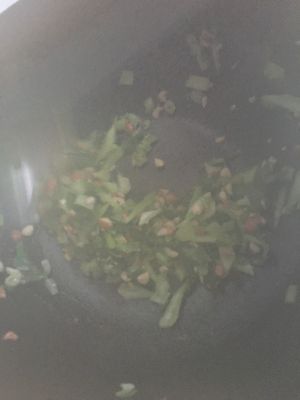 锅中倒入油烧温热时放入花生碎炒香,再加入油菜翻炒片刻