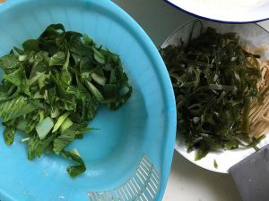 利用醒面的时间切菜,花生米切成小块,葱切葱花,油菜洗净切段,豆腐皮和海带丝切段,西红柿去皮切小块(菜多没有照进去)