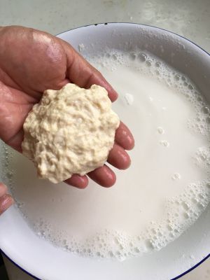 准备一大盆清水,将面团放入,两手不停交换搓洗,最后清水变白,面团逐渐成为一小块面筋