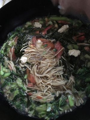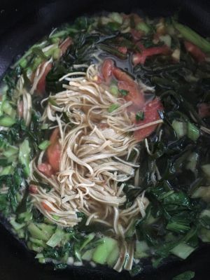 将面筋用手揪成小块,洒在锅里,煮开后盖上锅盖再煮约2分钟使面筋熟透