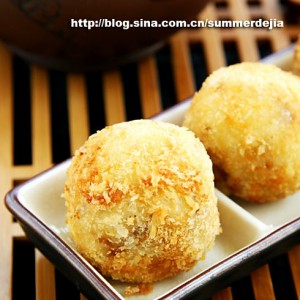 油温六成热时,放入裹好面包糠的小球,炸至金黄酥脆状即可;