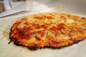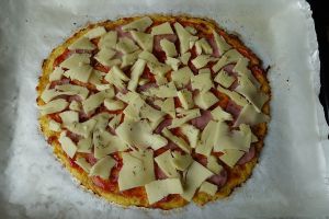 抹披萨酱(没有的用番茄酱+披萨草也行),撒火腿片,铺上马苏里拉奶酪;