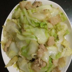 再加入包菜,炒软筋,加入1勺食用盐,1勺鸡精,停火,出锅!包菜要炒的脆脆的!一定记得要大火炒!