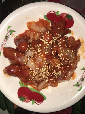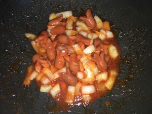 先放油 再放洋葱 感觉有洋葱香味的时候放香肠 再翻炒几下 然后把搅拌均匀的酱倒入锅中 感觉香肠熟的很快 要么就是原本就是熟的 等着收汁就差不多了