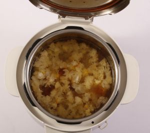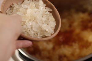 待高压锅消气,打开锅盖加入桃胶、皂角米继续煮20分钟