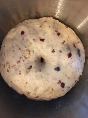 加入葡萄干、核桃仁,继续和面5分钟左右直到和面团完全混合。(如果觉得这样不易混合,可以在步骤5面包整形时铺上再裹入)