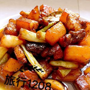 (凉水下过。放姜。料酒。把肉煮了。 去腥味。我没有拍照。) 锅内倒油。 炒肉。 稍微一炒。时间长了肉容易干。然后加一点水。把香叶桂皮八角。放进去。 再来点老抽。