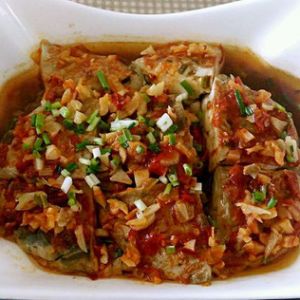 再放上蒜末,葱花,放一勺蒸鱼豆豉,因为剁椒比较咸,所以不用再放盐