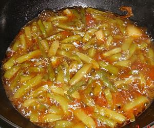 将五花肉编制!要炒出猪油哦!放入一半的大蒜,再放入扁豆炒香,放入适量干辣椒!放入盐,花椒粉,韩国辣酱,生抽上色