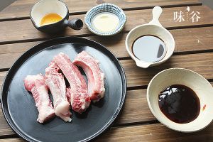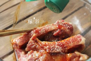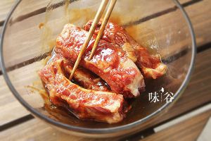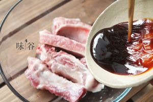 将料酒,生抽,叉烧酱一起拌成调味汁,倒入排骨中,搅拌均匀 。
