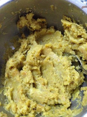 取出稍凉,剥去外皮,用勺子碾成蓉