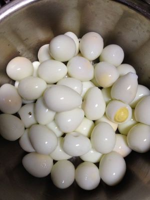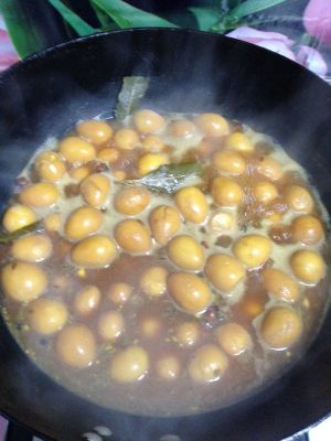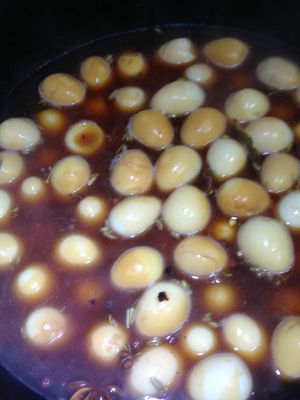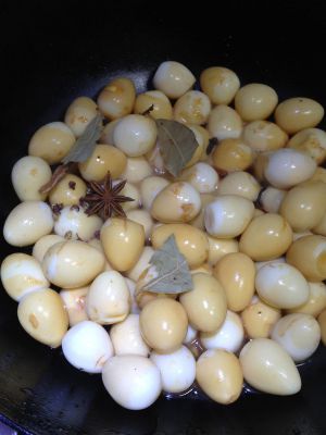倒入鹌鹑蛋上色,加入大料、花椒、香叶、桂皮、丁香
