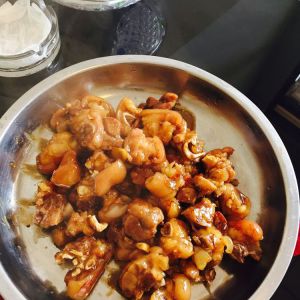 锅里放油,姜,蒜先爆一下,然后倒入猪脚一起爆炒,三分钟后加入可乐,刚好没过猪脚,盖上锅盖,中小火焖15分钟