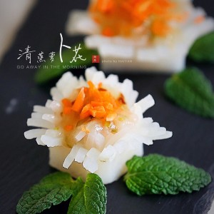 芡汁浇在萝卜花表面即可,萝卜蒸好后趁软整理成花型