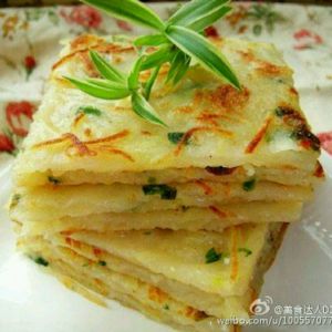 土豆切丝,葱切粒,放入面粉,加入盐,鸡粉