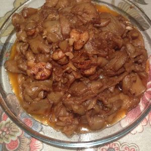 蒜瓣里的一半炝锅,虾仁放入煸熟,放入煸好的茄子,放甜面酱,盐,适量糖,放剩下的蒜瓣出锅