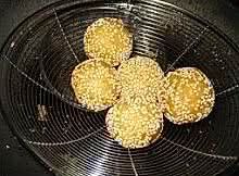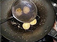 油先烧到六成热,然后再降回到三四成热的样子,保持火候不变,把团子放进去,马上轻轻的翻动团子,要不停的转动,用筛子底部像画圆圈一样来回把团子滚动,适当时候又轻轻把团子压扁,再放开,一直到团子炸的是原来的两倍以上,直到表面金黄圆润。
