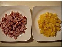 菠萝半个挖出果肉,留壳备用,火腿切丁备用;