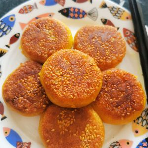 包好黑豆沙馅的南瓜饼,稍稍压扁,两面都均匀的粘上适量的白芝麻,为了好看吃起来更香