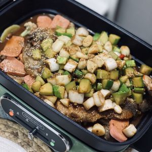 炒好的配料倒入鱼盘中,开火加热,就可以享用啦