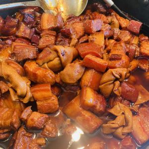 油锅里下冰糖,化开成棕色后下肉炒糖色