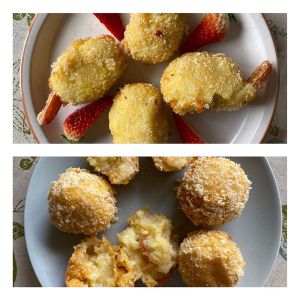 豆泥平铺掌心儿,放提拉米苏➕虾段➕提拉米苏➕盖上层土豆泥,做手工似的捏捏揉揉成团儿玩吧!带虾尾部分的把虾尾留外面,小尾巴儿。