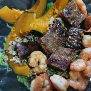 煎好的牛排虾仁,煮熟的藜麦,蒸熟的南瓜,倒入糖醋汁