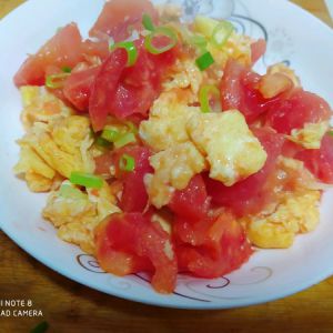最后放入鸡蛋和适量盐、青葱圈,翻遍两到三遍,香喷喷的西红柿炒鸡蛋就完工了!