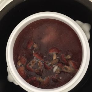 20分钟后,将红菇和泡红菇的水一起加入到排骨中,然后继续炖10分钟。