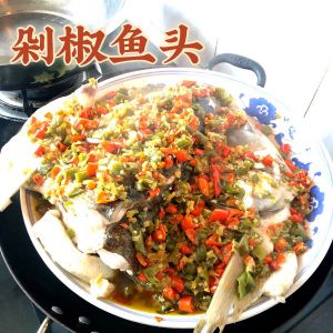将准备好的杭椒末,红辣椒末,葱末,蒜末,姜末炒香。均匀的铺在鱼头上。加入蒸鱼豉油,生抽,味精,胡椒粉。上锅蒸20分钟