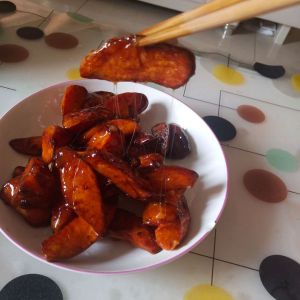 留少量底油,放入适量白糖,小火熬制融化,糖微开冒小泡微微发黄(注意别糊)加入炸好的地瓜,翻炒均匀就可以出锅了。