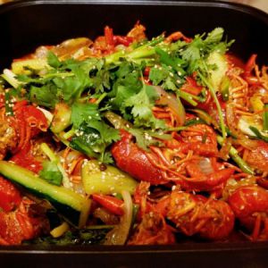 将龙虾倒入铺好的土豆上面,撒上葱花,香菜,白芝麻就完成啦