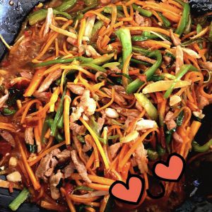放入提前备好的配菜,木耳没有找到,泡点木耳切丝更好,放入一碗,(盐,鸡精,糖,生抽,香醋,淀粉,加水,调制的汤汁)翻炒至汤汁浓稠,出锅