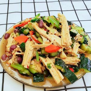 放入蔬菜类——腐竹,芹菜,胡萝卜黄瓜,花生米,香菜。然后倒入两勺陈醋,白糖一勺,生抽一勺,芝麻油一勺搅拌均匀