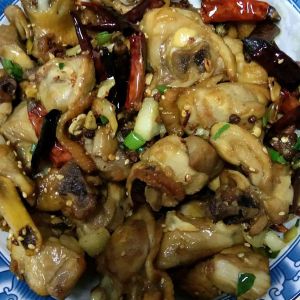 锅内倒入色拉油,放入辣椒,花椒粒,煸炒出香味,放入葱蒜继续煸炒,然后倒入炸好的鸡块,煸炒,撒盐少许,芝麻少许,可以撒学葱花出锅即可。