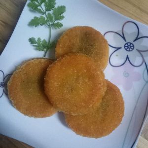 把面包糠倒入碟子中,裹上,面软一点还是很好沾的,都沾满,可以适当整形,圆一点好看