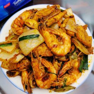 将基围虾、章鱼足、素鸡、洋葱及大蒜叶倒入锅中,并放入一整包麻辣香锅料(我这里用的留意家100g装的。)