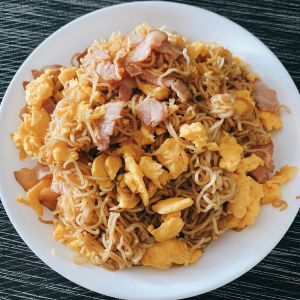 下调料油包和面,翻炒,下粉包,翻炒,下培根鸡蛋,翻炒。