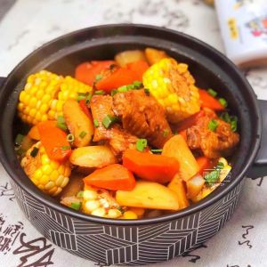 倒入玉米、胡萝卜、土豆和调好的酱汁;