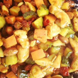 倒入黄瓜,胡萝卜,葱白丁翻炒,再倒入鸡胸肉,炸好的花生米,然后把调好的料汁倒入锅中翻炒上色。