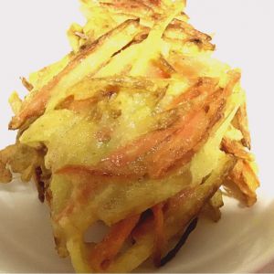 把胡萝卜丝和土豆丝捞出,加入胡椒粉、孜然、面粉、水、葱花、鸡蛋、蚝油和盐搅拌成糊状