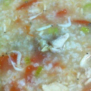 煮好的鸡汤捞掉骨头和姜,放入番茄丁和虾米煮5分钟