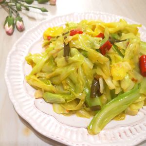 锅里烧热后下油,把大蒜和泡菜一起下锅炒香后加入包菜一起炒三分钟,再加盐提味