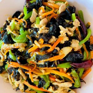木耳提前泡发与胡萝卜、青椒一起切丝;