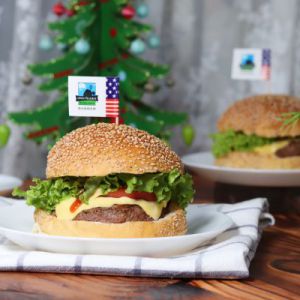 烤好的汉堡坯晾凉,从中间横着切开,把牛肉饼放上去,趁热放芝士片,上面摆上酸黄瓜