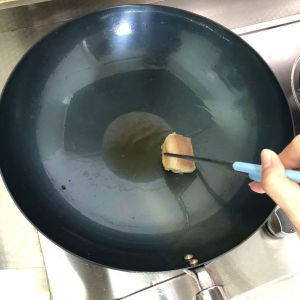 锅内少许油,煸炒回锅肉,中火慢慢煸出油,盛出。