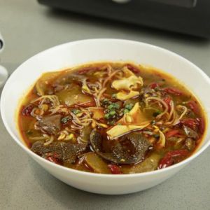 加入黄喉、毛肚和胡椒粉,盖上锅盖和量杯烧煮,设置:2分钟/140℃/1档/反转。
