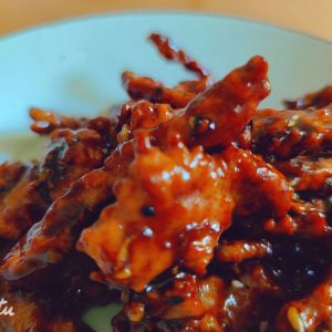 锅留底油,下入姜末爆香,下入碗汁,加水淀粉勾芡至汤汁浓稠,加少许油,下入肉段迅速翻炒均匀即可出锅